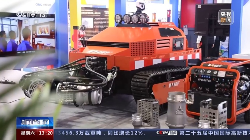 分台央视记者 褚尔嘉:正在我身旁的那台设备名字叫当急供排水机械人,凡是我们喜好称号它为排涝机械人。正在一些呈现洪涝灾祸的处所,如许一台设备,能够很是无效地共同消防当急办理部分的大型消防车,来进行一些现场的排水功课。