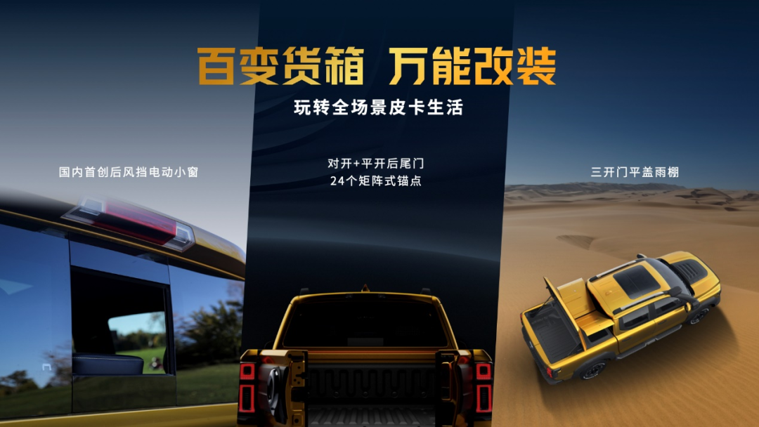 此外,山海炮机能版还拥无丰硕多变的功能设想,以百变货箱、全能改拆满脚户外百变糊口需求。国内初创后尾门对开+平开设想,车箱预留24个矩阵式锚点、4个挂钩,车内车外双220V电流接口贴心设想,帮力用户玩转全场景皮卡车糊口。本厂自带C6拖挂牵引天分,满脚3.3吨拖车认证,可拖挂房车、摩托艇、逛艇等,为玩家解锁更多创意弄法。