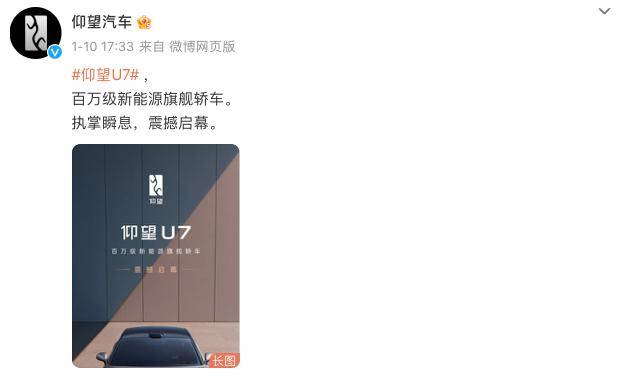 获取到仰望品牌全新车型——仰望U7申报图。新车是继仰望U8和仰望U9后,仰望品牌的第三款车型,一周前,仰望汽车正在微博官宣仰望U7定位“百万级新能流旗舰轿车”,新车采用难四方和云辇手艺,估计售价也将达百万级别。