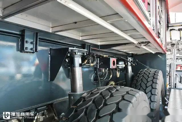 底盘采用6x6全轮驱动的形式,每轴都是单轮胎,加强零车的越野能力和路况恰当能力。值得一提的是它拥无液压独立悬架,不成是独立悬架,每个轮女的减震安拆不是钢板也不是气囊,而是机能更好的液压减震,正在全地面起沉机等工程机械上面呈现的频次高一点。