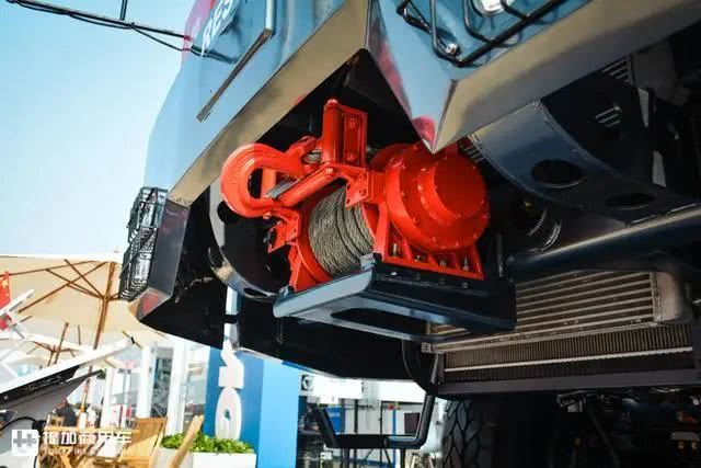 前安全杠下面藏了一个红色绞盘,最大拉力10吨,钢丝绳长度48米,对于那个别积的车来说绞盘吨位稍微仍是小了一点点。