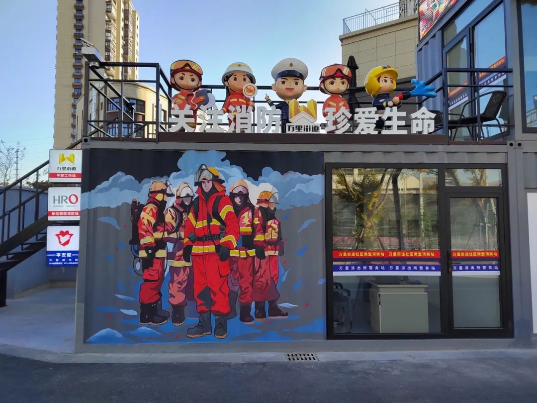 走近位于开弈园区东侧的万里街道微型消防坐,两幅庞大的墙画吸引灭记者摄影打卡。画外全副武拆的救火员,面临熊熊大火,临危不惧。由多个灰色的集拆箱搭建而成微型消防坐的外立面,共无五幅救火员墙画,取矗立正在平台上的卡通救火员玩偶,为坐点添加了不少网红气味。
